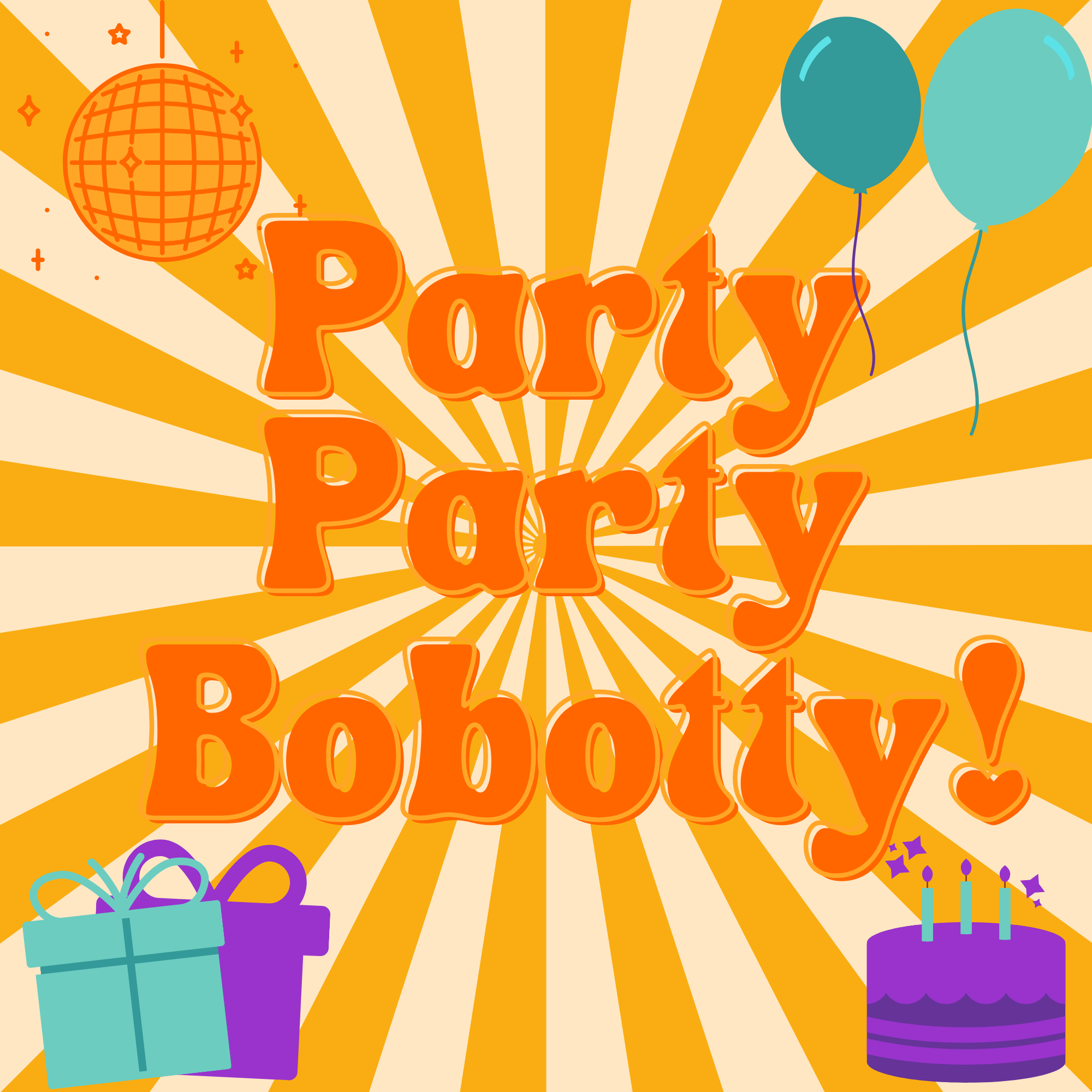 Logo for Party Party Bobotty summer theme. Image includes orange designs plus a disco ball, balloons, birthday cake, and presents.