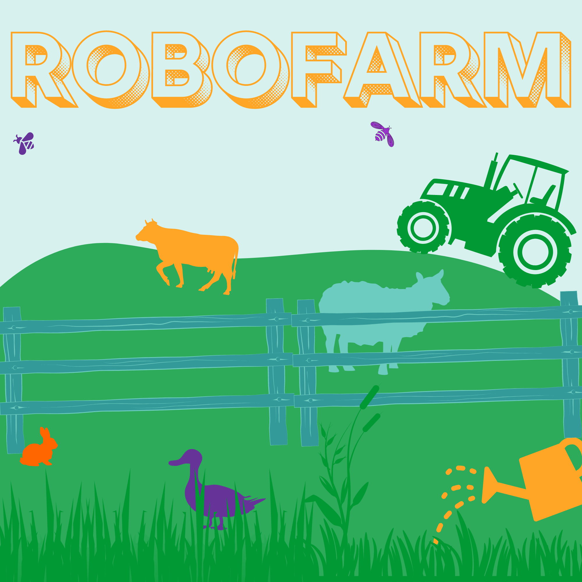 Graphic logo for RoboFarm summer theme. Design is dominantly green and blue, with silhouttes of farm animals and tractor.